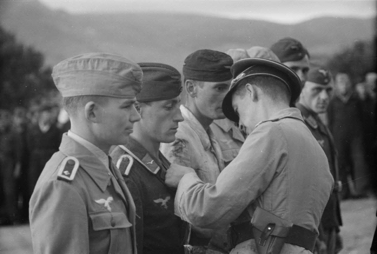 A Kastelli, le capitaine (Hauptmann) Meyer remet des décorations à des membres d'une unité de reconnaissance (Fernaufklärungsgruppe).