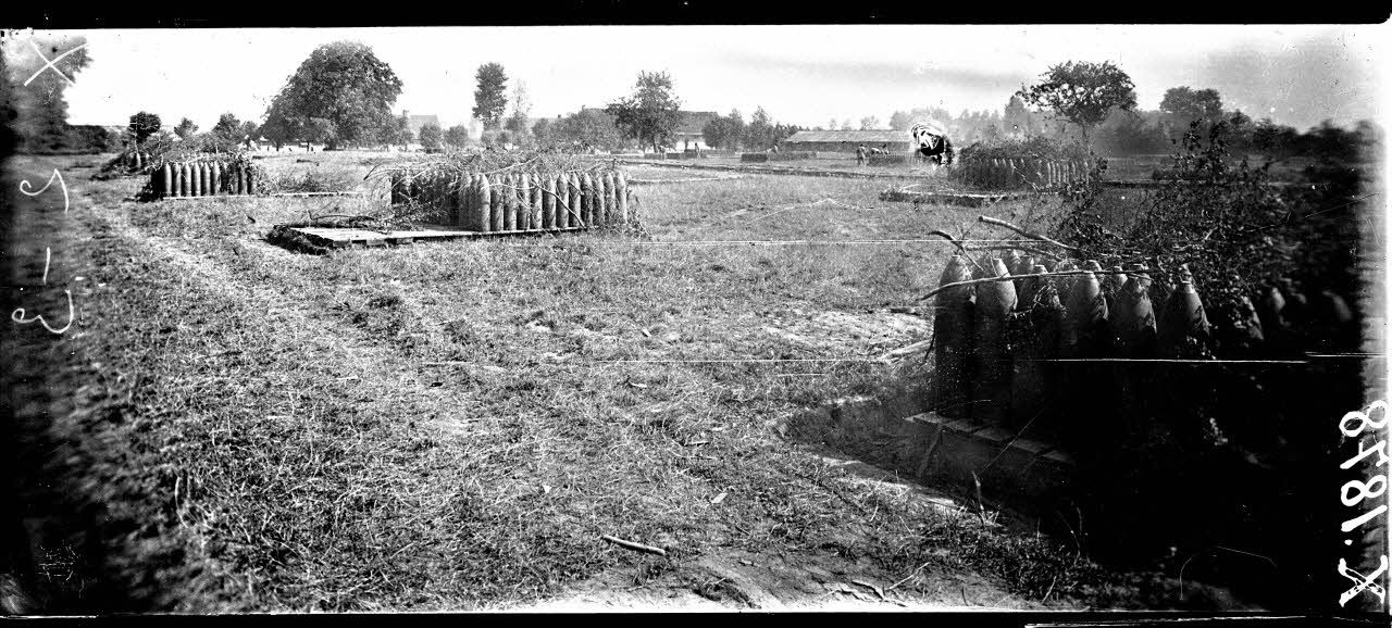 A Krombeke (Belgique) dépôt de munitions, camouflage de lots d'obus de 155.
