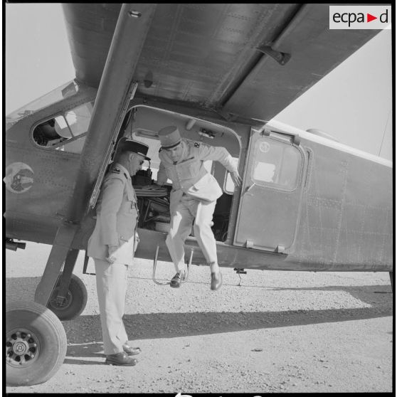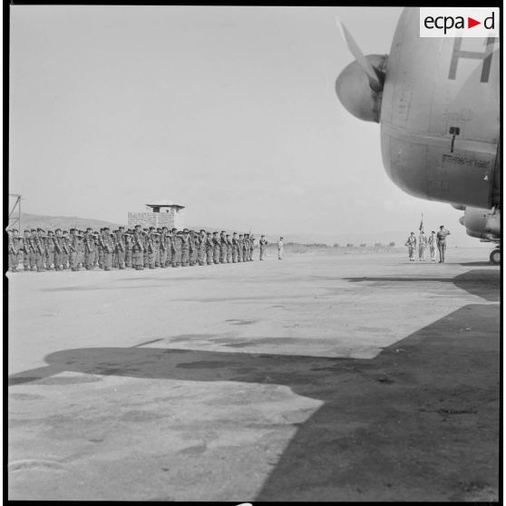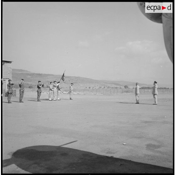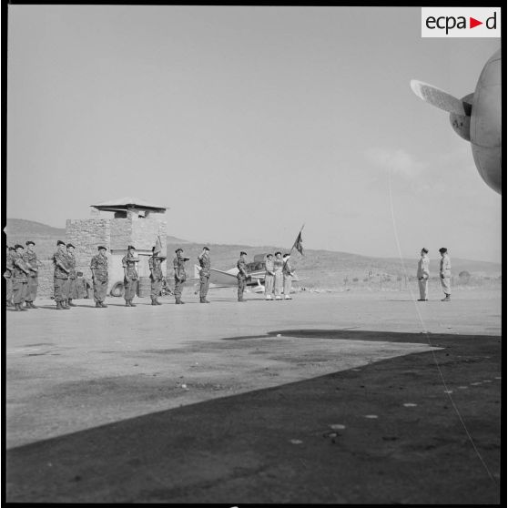 [A l'aéroport de Nazereg-Flinois, deux soldats et un porte-drapeau sont au garde-à-vous pour l'arrivée d'un général de corps d'armée.]