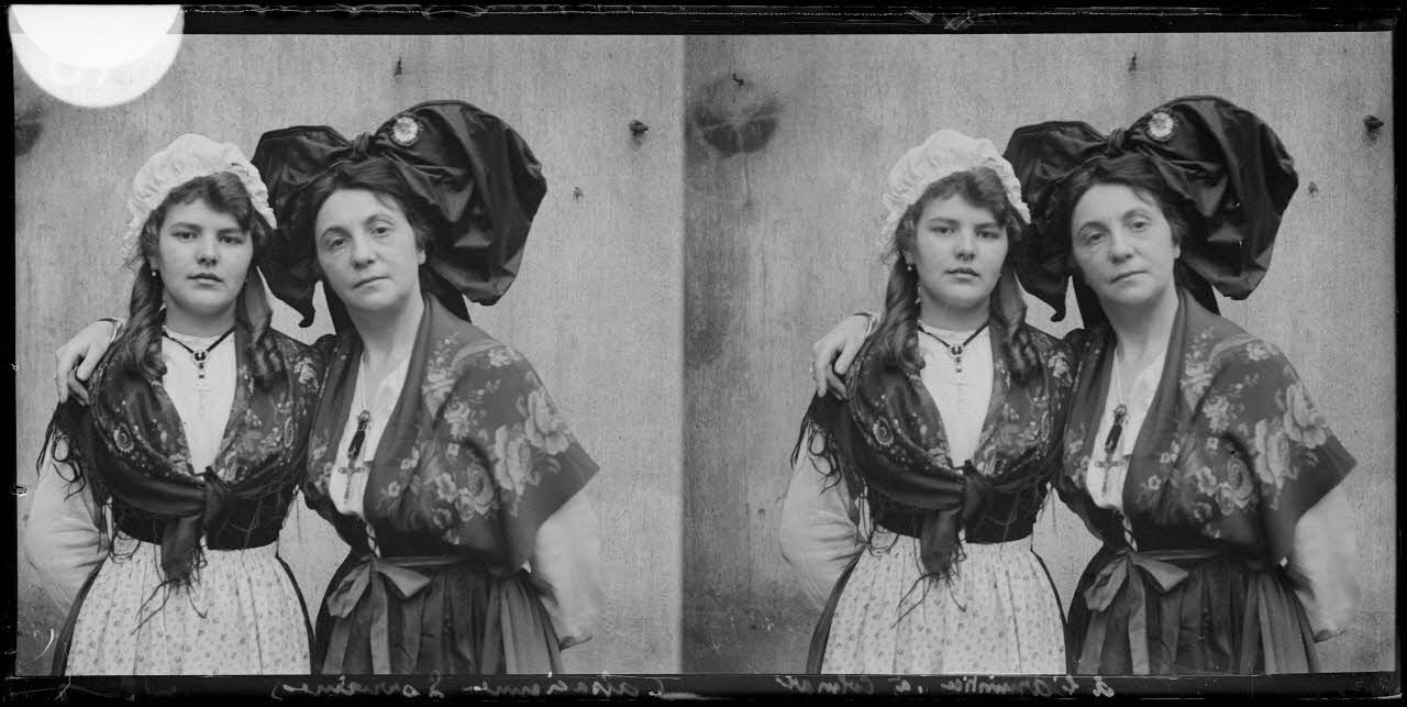(1) "On retrouve dans les archives beaucoup de plaques au gélatino-bromure d'argent identiques aux autochromes : il était en effet possible d'utiliser la même chambre 13x18 pour produire un autochrome car il suffisait de changer la plaque, ajuster le temps de pose (beaucoup plus long pour l'autochrome), changer de filtre et demander aux sujets photographiés de garder la pose pendant ce temps! " (www.tournassoud.org)