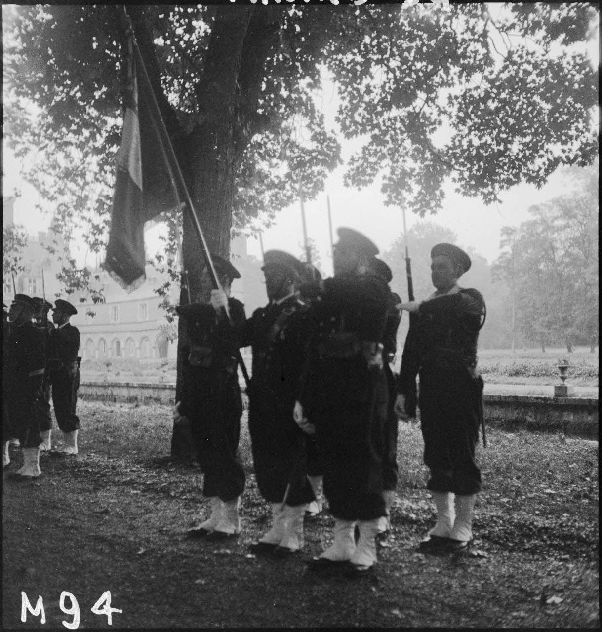 Un détachement de fusiliers marins rend les honneurs à l'arrivée du président de la République, Albert Lebrun, dans le camp d'entraînement.