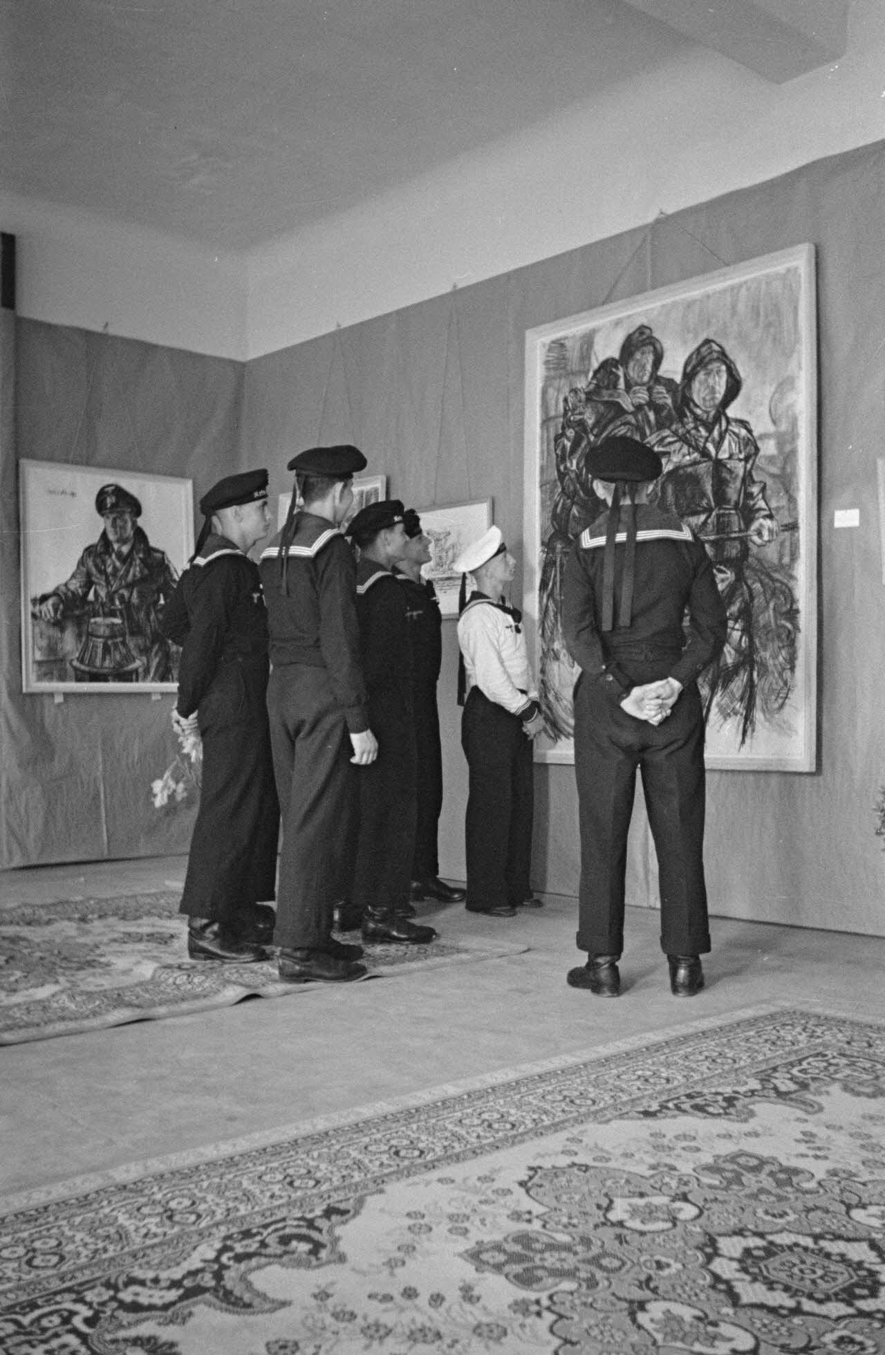 A l'hôtel Royal de La Baule, des marins allemands de la Kriegsmarine visitent l'exposition consacrée aux peintres de guerre Lothar-Günther Buchheim et Richard Schreiber.