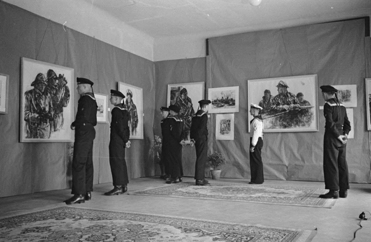 A l'hôtel Royal de La Baule, des marins allemands de la Kriegsmarine visitent l'exposition consacrée aux peintres de guerre Lothar-Günther Buchheim et Richard Schreiber.
