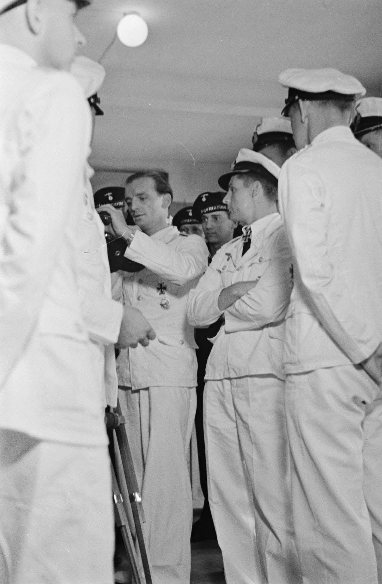 Les sous-mariniers Engelbert Endrass, Claus Korth, Heinrich Lehmann-Willenbrock, Erich Topp et Herbert Kuppisch entrent dans l'hôtel Royal de La Baule où a lieu une exposition de peintres de guerre.