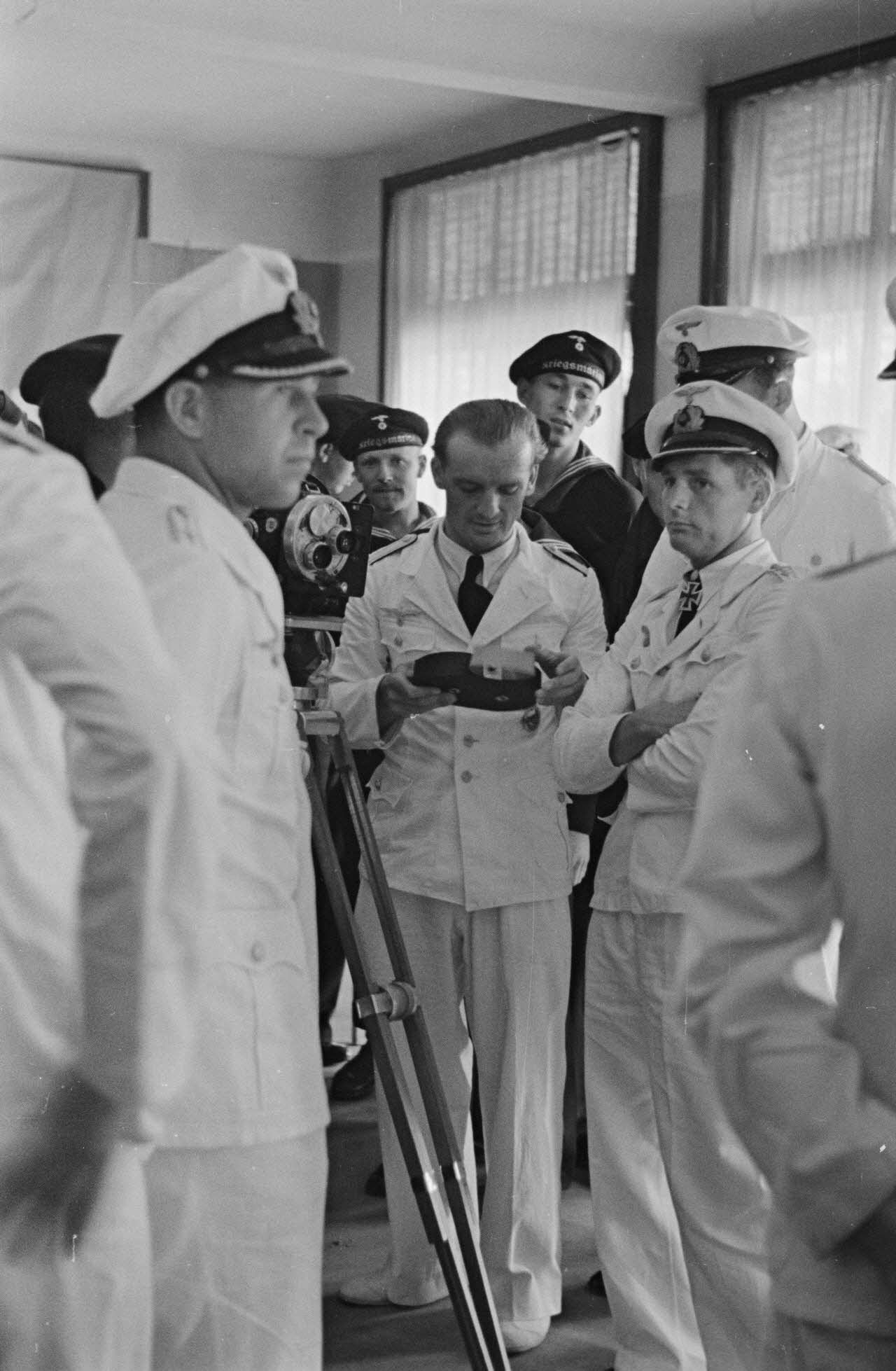 Les sous-mariniers Engelbert Endrass, Claus Korth, Heinrich Lehmann-Willenbrock, Erich Topp et Herbert Kuppisch entrent dans l'hôtel Royal de La Baule où a lieu une exposition de peintres de guerre.