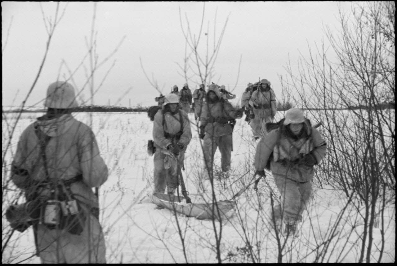 A l'issue d'une patrouille, des fantassins allemands (Jäger) rejoignent leur point de départ situé derrière une ligne de chemin de fer.