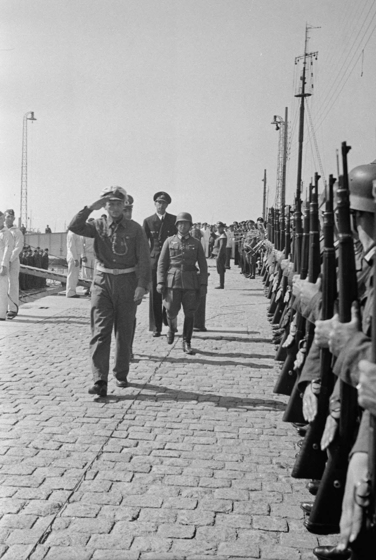 A l'issue de sa 5e mission en mer à bord du sous-marin U-552, le lieutenant (Oberleutnant zur See) Erich Topp passe en revue des autorités de la Kriegsmarine rassemblées sur le quai du port de Saint-Nazaire.