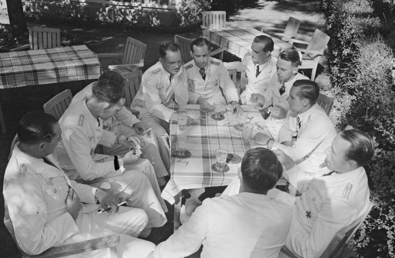 A La Baule, autour d'une table, le reporter Heinrich Schwich entouré par les sous-mariniers Engelbert Endrass, Claus Korth, Heinrich Lehmann-Willenbrock, Erich Topp et Herbert Kuppisch.