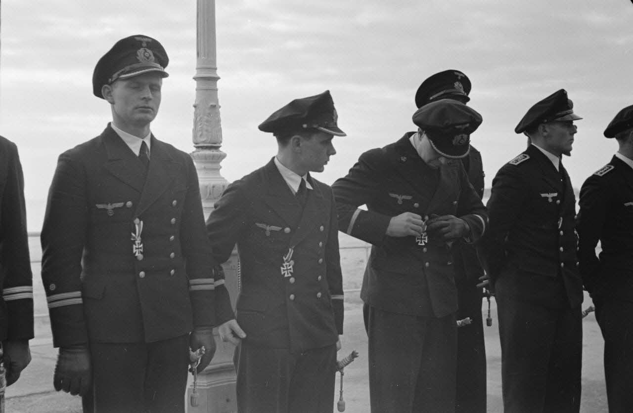 A La Baule, les officiers sous-mariniers du U-Boot U-96 et le reporter Lothar-Günther Buchheim (au centre) viennent de recevoir la croix de fer des mains de l'amiral Dönitz.