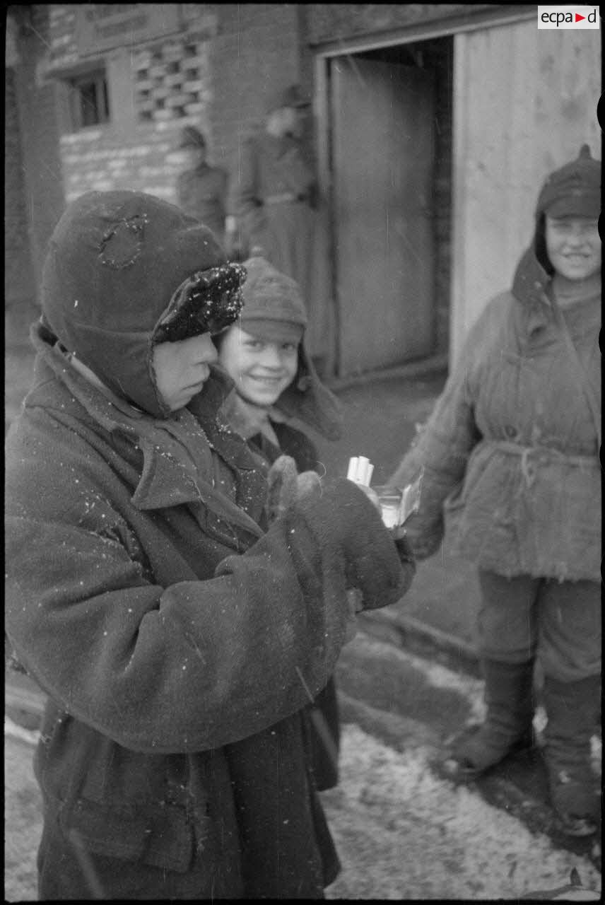 Sur une place de Vitebsk (Witebsk), la circulation est assurée par Feldgendarme, on reconnaît sa plaque hausse-col. Des femmes issues de la minorité allemande, ou qui travaillent pour l'occupant, sourient au photographe qui les immortalise. A la gare de Vitebsk (Witebsk), des permissionnaires de retour de leur foyer vont rejoindre leur garnison. Les soldats déposent leur paquetage sur un traineau pour en faciliter le transport. Les traineaux sont tractés par des enfants qui échangent leur service contre du pain ou des cigarettes.