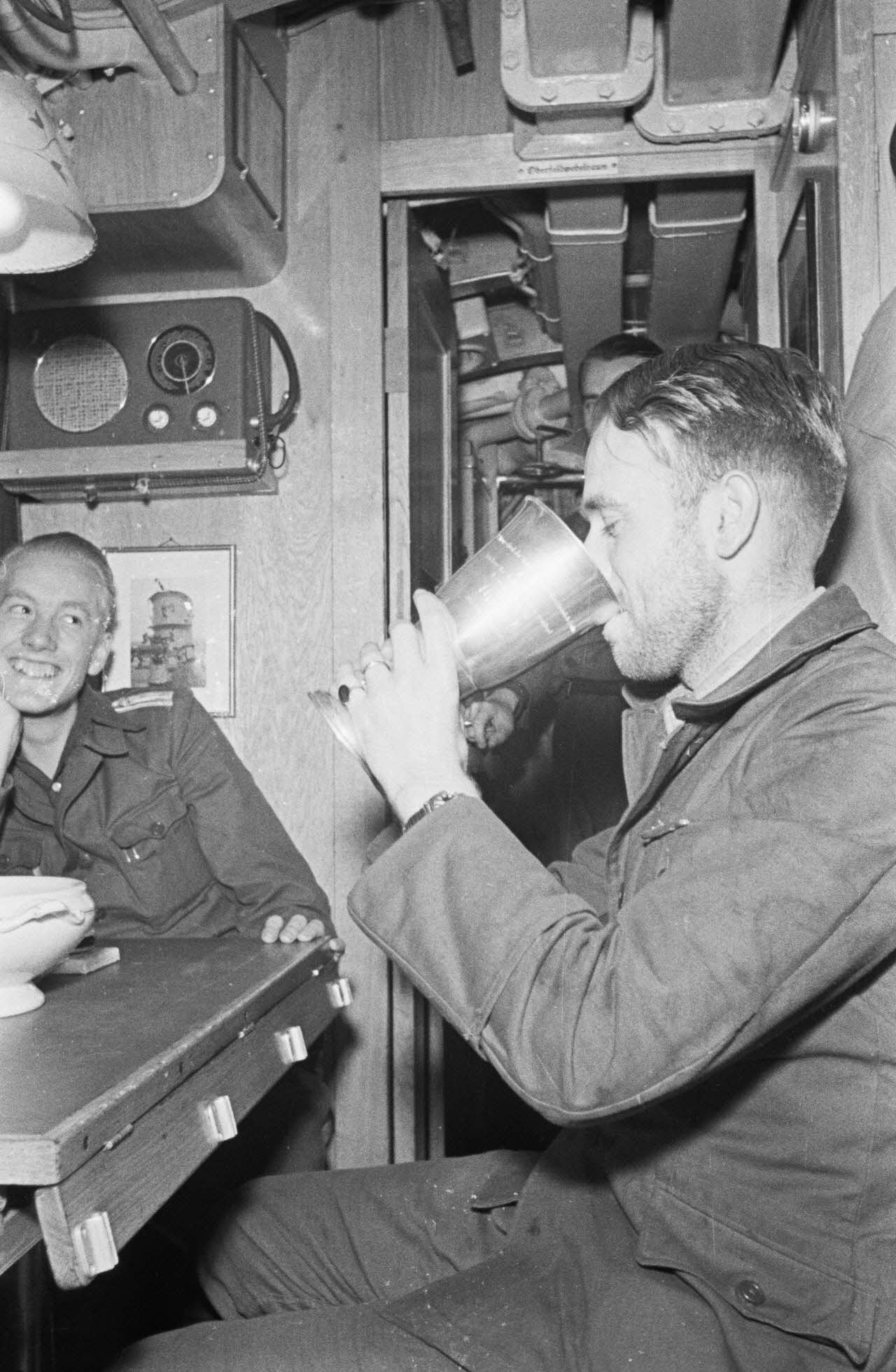 A la table réservée aux officiers du bord, le Kapitänleutnant Rolf Mützelburg commandant du sous-marin U-203, boit un liquide contenu dans un Ehrenpokal.