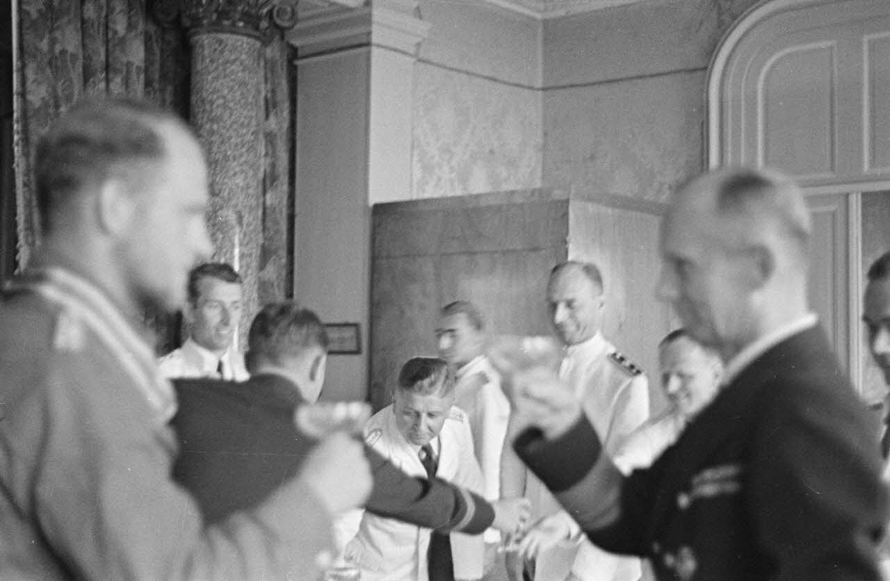 A Lorient, peu après sa remise de décoration (Ritterkreuz), le lieutenant Erich Topp trinque avec le personnel du quartier général des sous-marins allemands ou BdU, Befehlshaber der U-Boote.