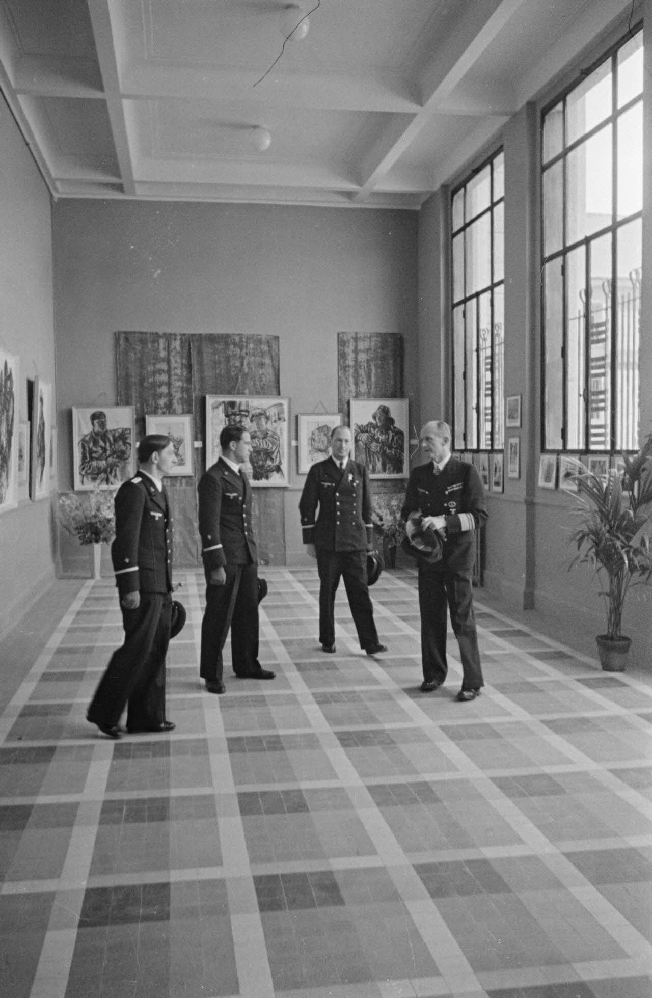 A Lorient, l'amiral Karl Dönitz visite l'exposition de peintures de guerre en présence de son état-major et de membres de la Marine Propaganda-Abteilung West.