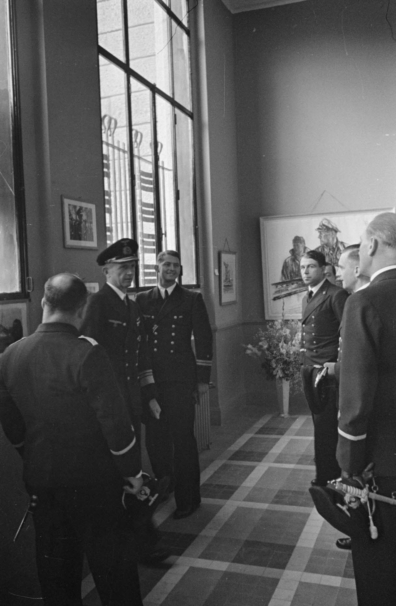 A Lorient, l'amiral Karl Dönitz visite l'exposition de peintures de guerre en présence de son état-major et de membres de la Marine Propaganda-Abteilung West.