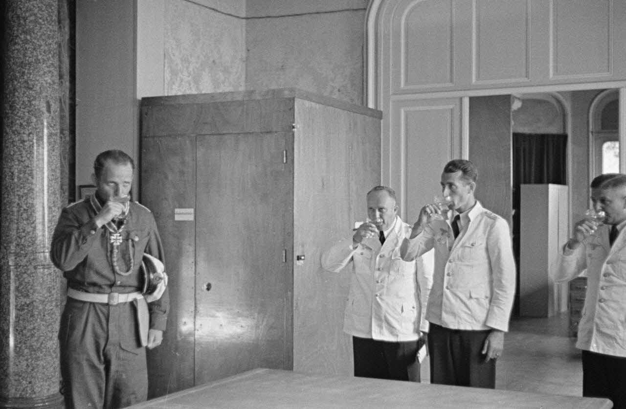 A Lorient, peu après sa remise de décoration (Ritterkreuz), le lieutenant Erich Topp trinque avec le personnel du quartier général des sous-marins allemands ou BdU, Befehlshaber der U-Boote.