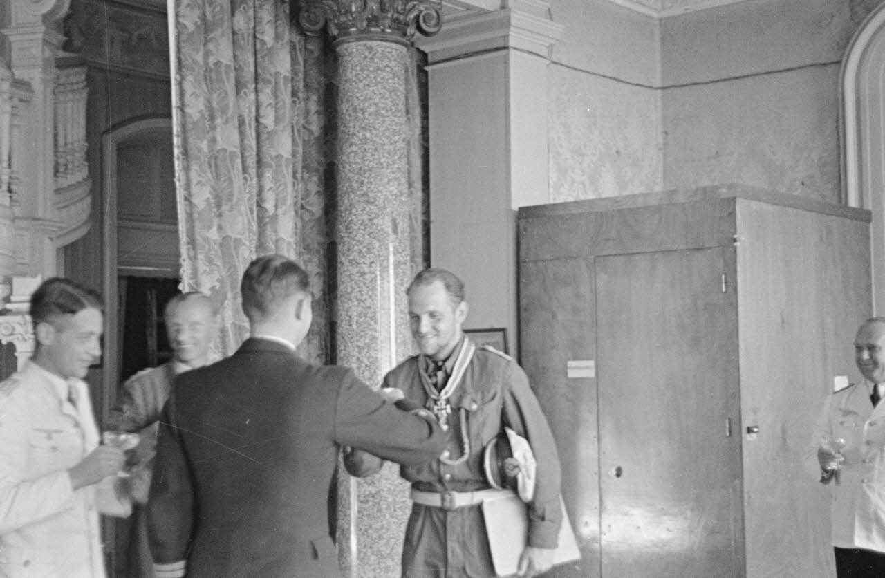Le lieutenant (Oberleutnant zur See) Erich Topp est reçu au quartier général des sous-marins allemands de Lorient pour la remise de sa croix de chevalier de la croix de fer (Ritterkreuz).