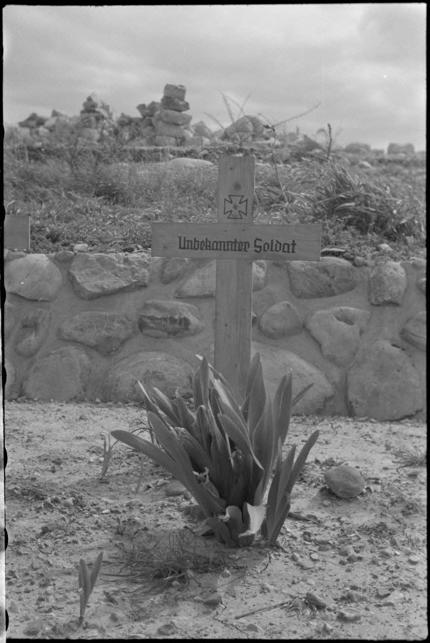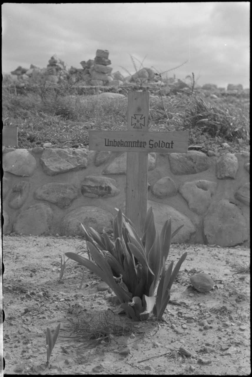 Au cimetière de Maleme (Crète), un caporal de la Luftwaffe se recueille devant des tombes de parachutistes allemandes tombés lors de l'opération Merkur.