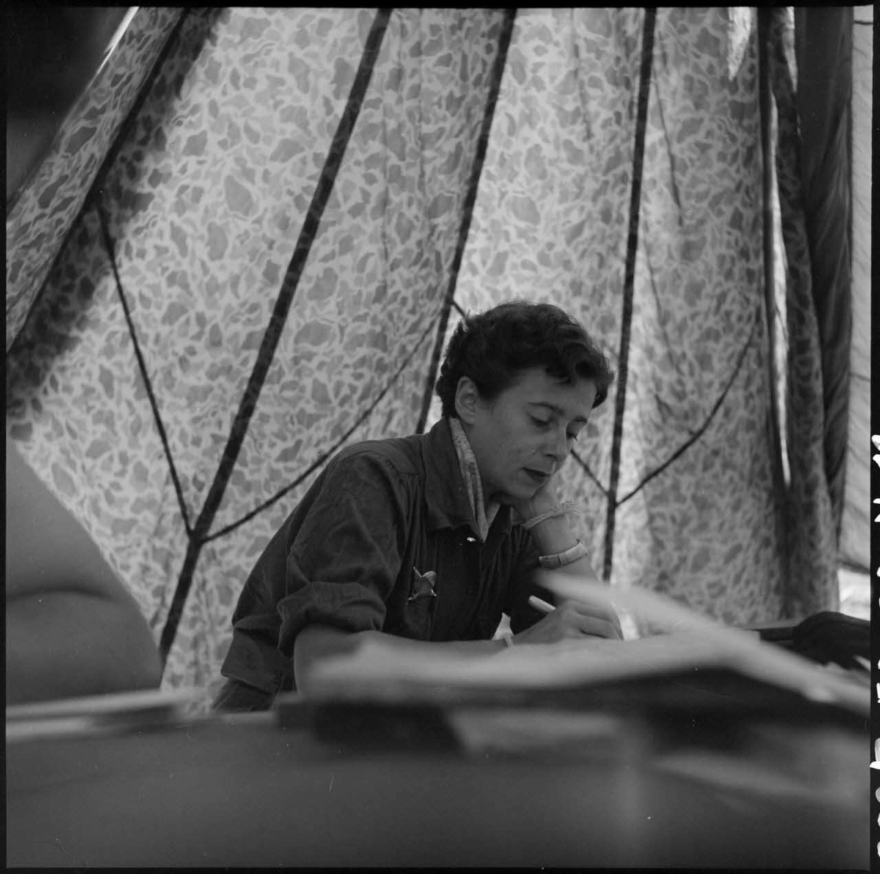 A Muong Khoua sous une tente en parachute, la journaliste Brigitte Friang du Service français d'information (SFI) rédige son article.