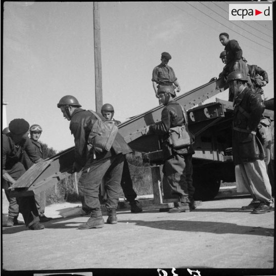 Des soldats de la 6e armée mettent en place des rampes d'accès à l'arrière d'un camion porte-chars.