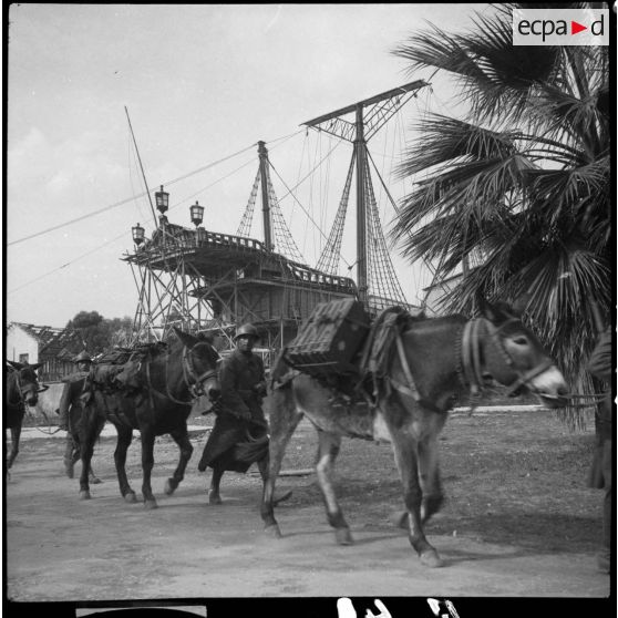 Une colonne muletière de la 6e armée passe au milieu des décors de cinéma.
