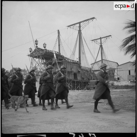 Une unité constituée de la 6e armée marche au pas, fusil sur l'épaule, au milieu des décors de cinéma.