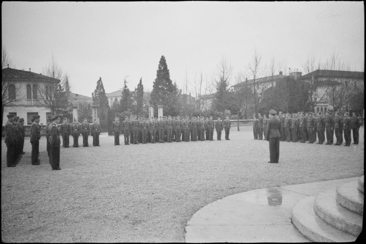 A Pordenone, le 29 février 1944, la prise d'armes lors de laquelle le commandant Hans-Günther Nedden du III./LG1 (Lehrgeschwader 1) est décoré de la croix allemande en or (Deutsches Kreuz in Gold).