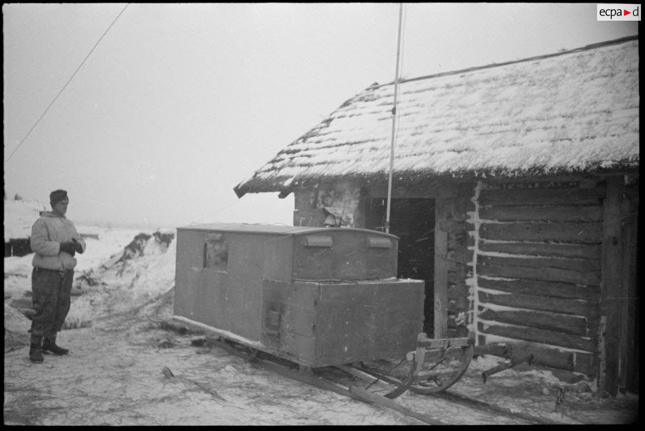 A proximité d'une isba, le reporter photographie un poste émetteur installé sur un traîneau.