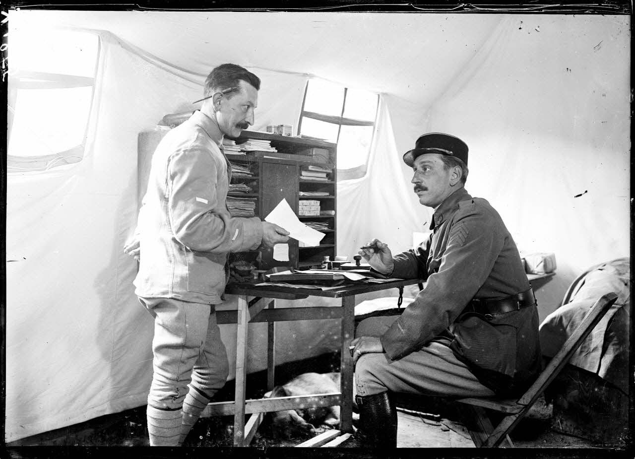 A Rexpoëde (Nord), le lieutenant Randouin, chef du service automobile, est à l'intérieur d'une tente Dickson. [légende d'origine]
