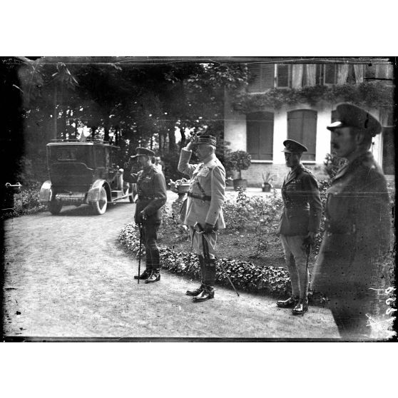 A Rexpoëde (Nord), QG de la 1re armée, visite du roi d'Angleterre. Le roi et le général François Antoine.