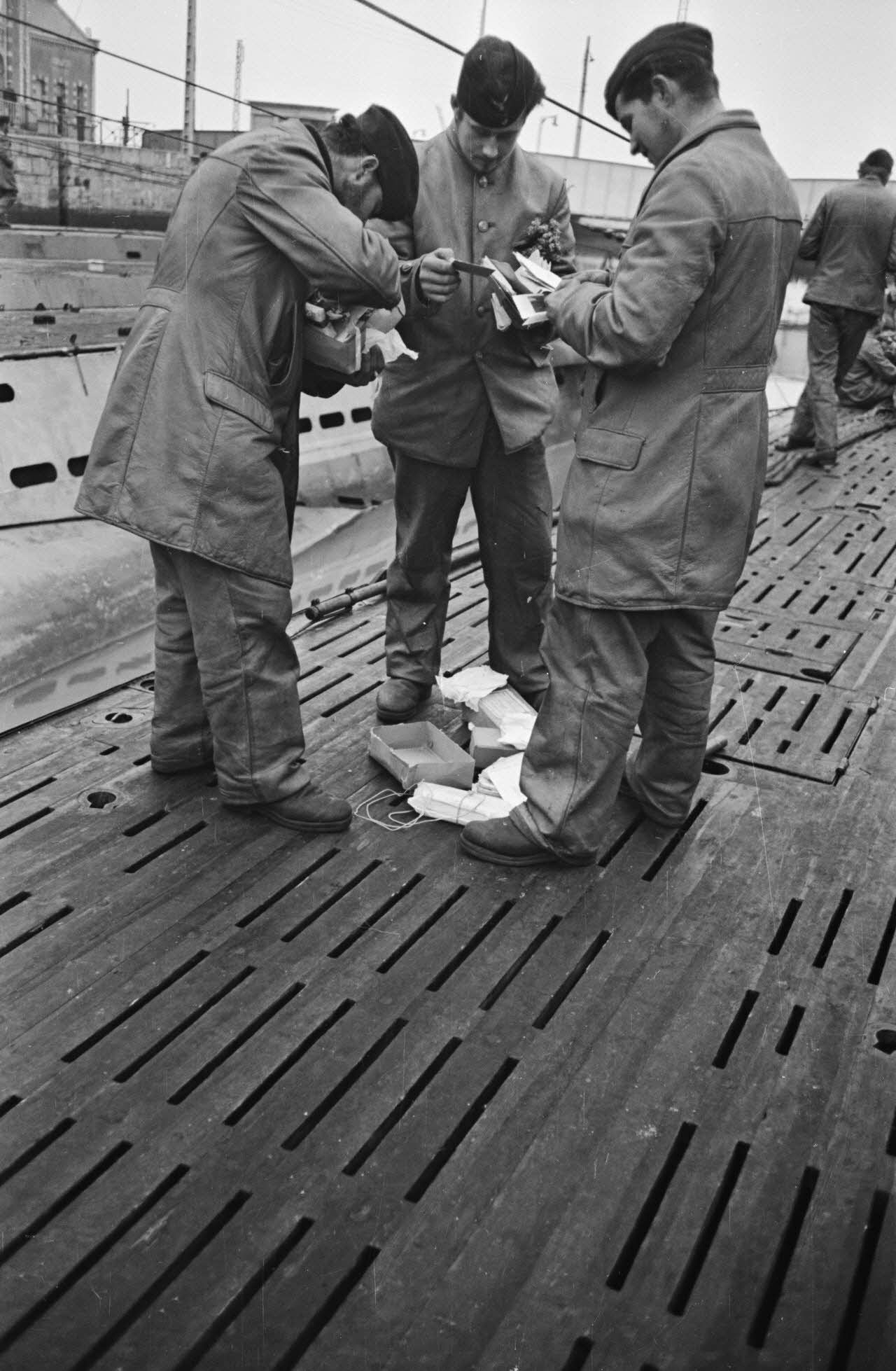 A Saint-Nazaire, à peine de retour de croisière, des sous-mariniers allemands parcourent la presse ou le courrier reçus pendant la mission.