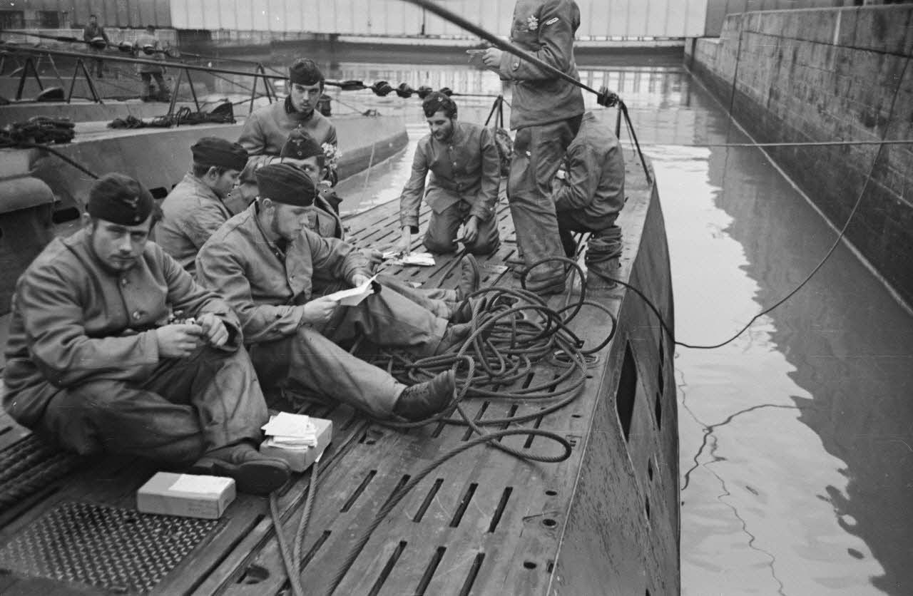 A Saint-Nazaire, à peine de retour de croisière, des sous-mariniers allemands parcourent la presse ou le courrier reçus pendant la mission.