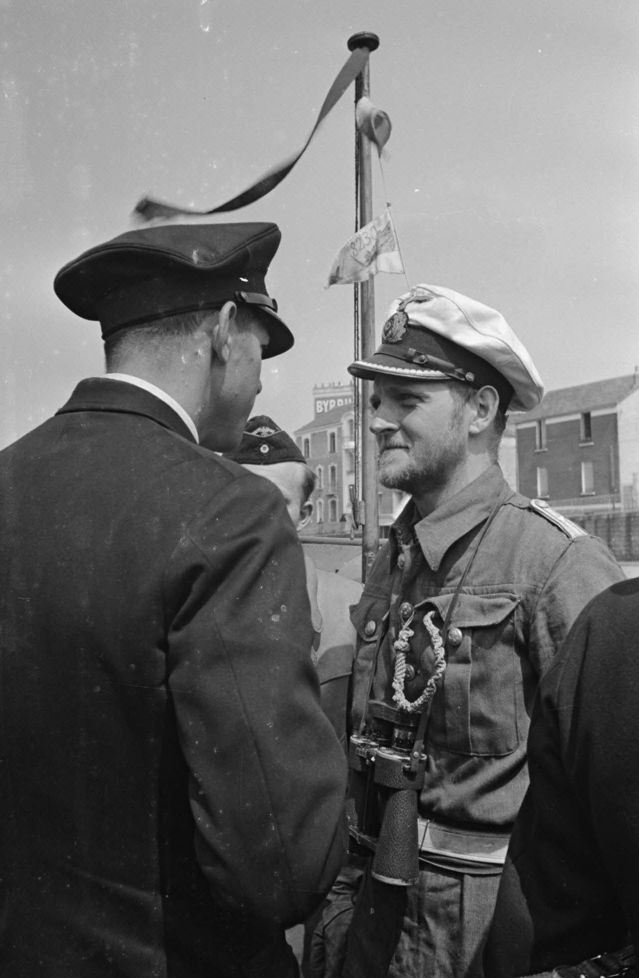 A Saint-Nazaire, lors du retour du sous-marin U-552, des officiers de la Kriegsmarine réservent un accueil chaleureux à son commandant le lieutenant (Oberleutnant zur See) Erich Topp et à son équipage.