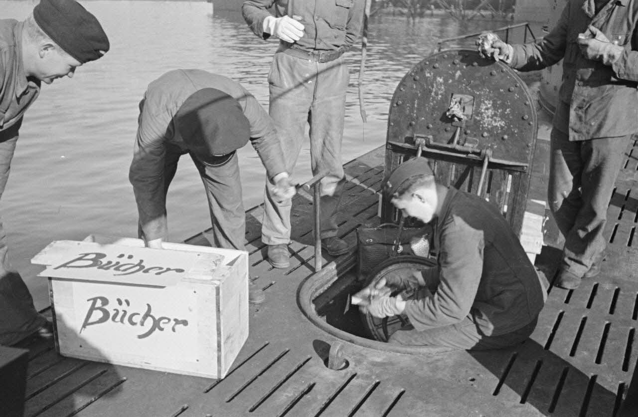 A Saint-Nazaire, dans le cadre de la semaine du livre allemand, la livraison et le chargement de livres pour un équipage de sous-marin allemand.