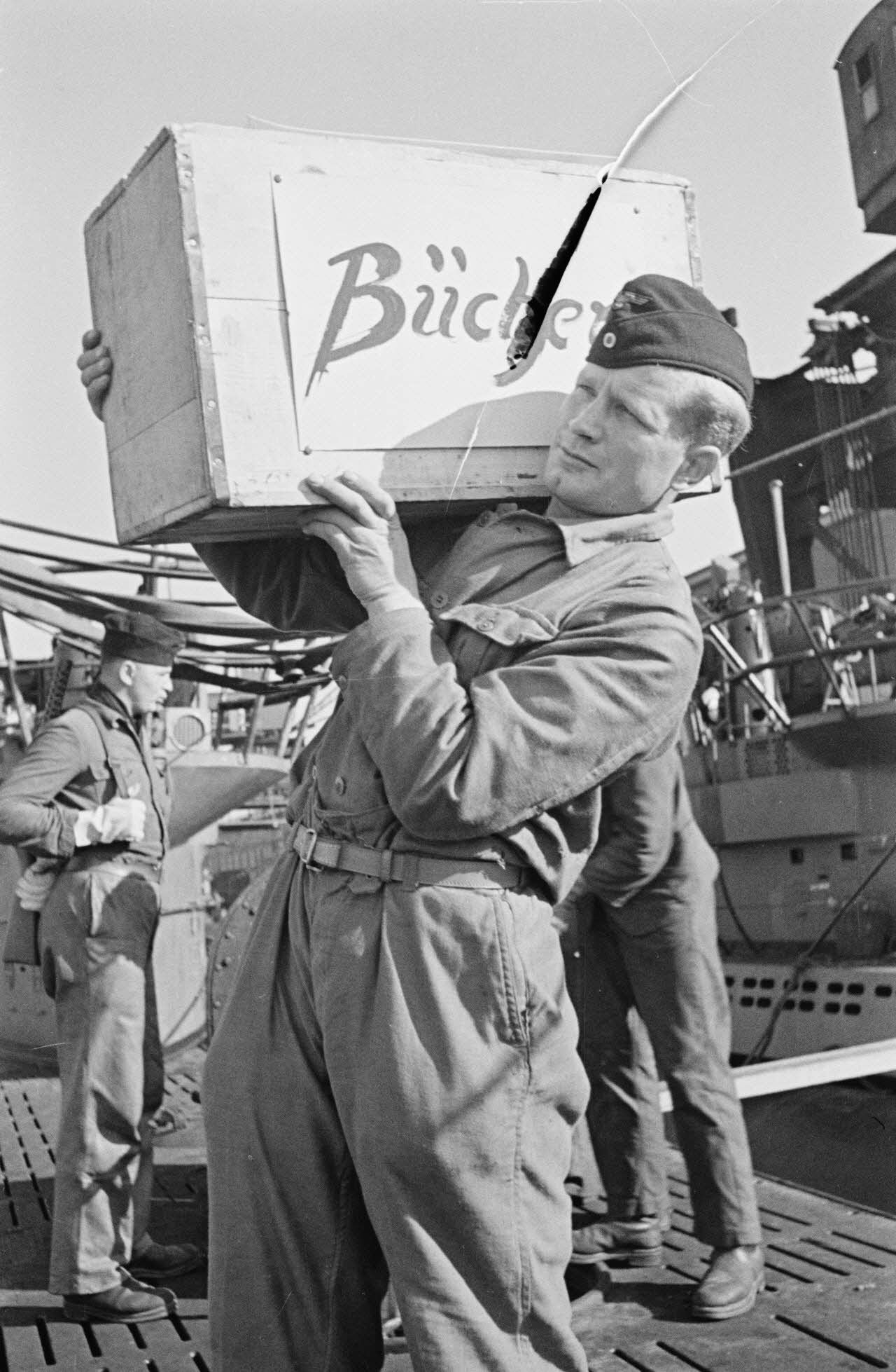 A Saint-Nazaire, dans le cadre de la semaine du livre allemand, la livraison et le chargement de livres pour un équipage de sous-marin allemand.