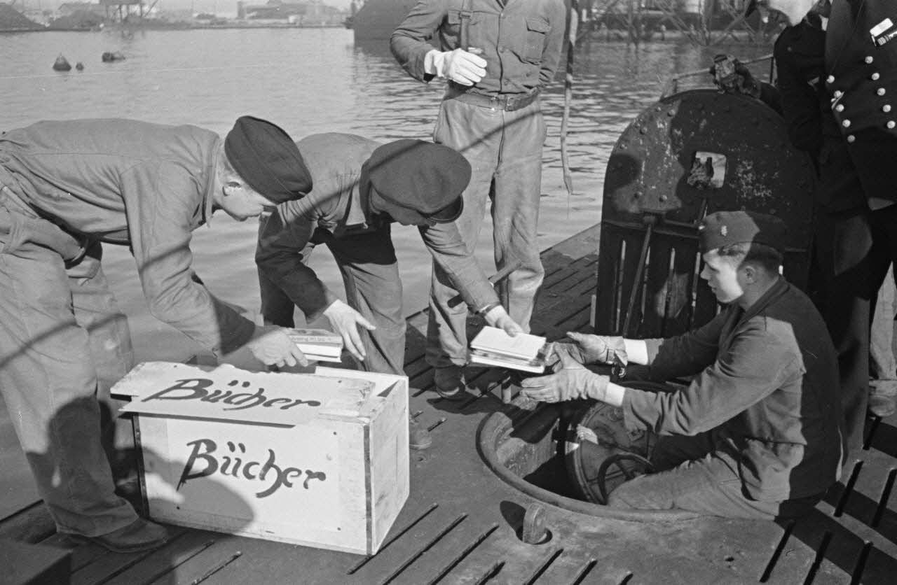 A Saint-Nazaire, dans le cadre de la semaine du livre allemand, la livraison et le chargement de livres pour un équipage de sous-marin allemand.