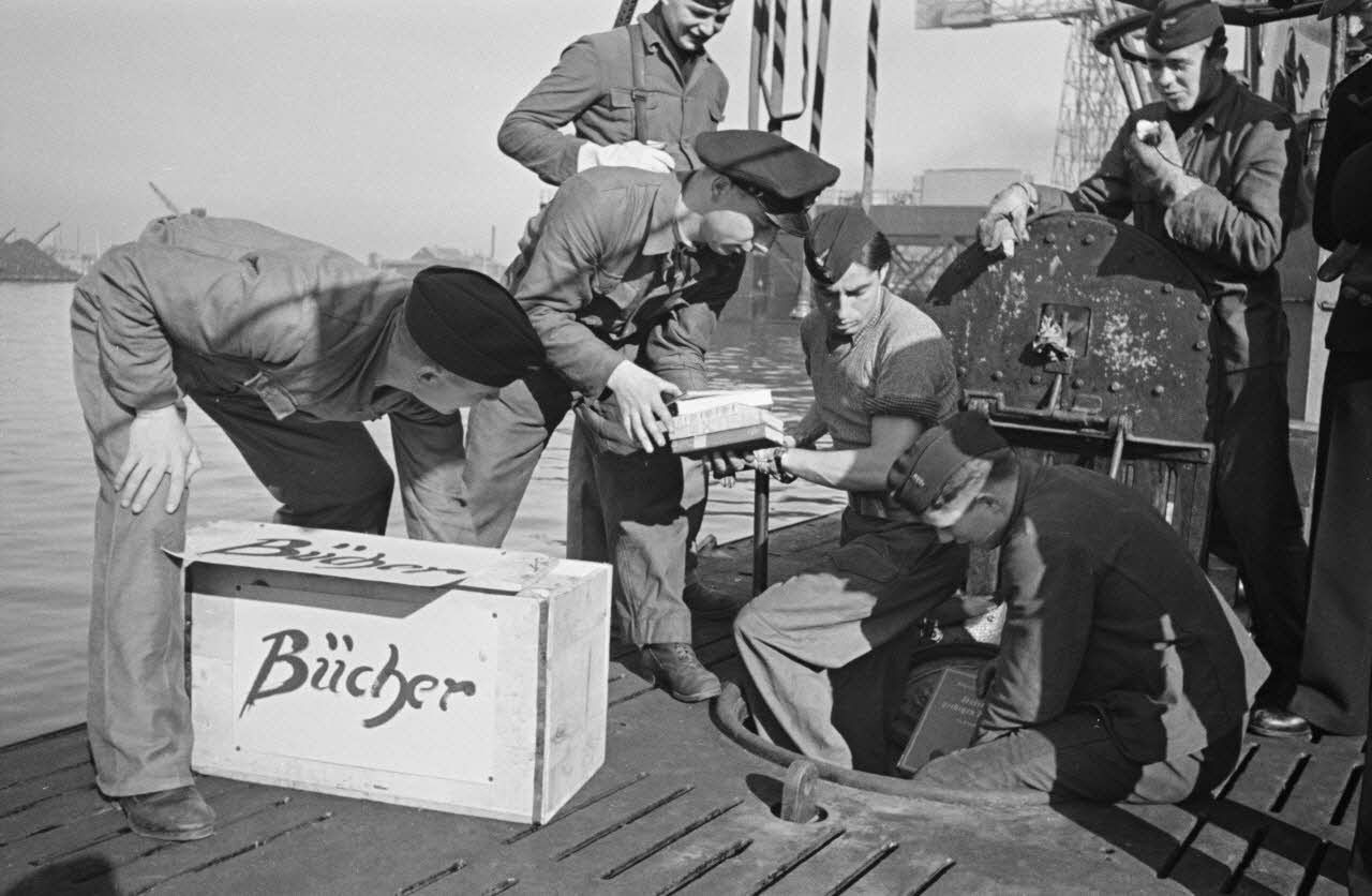 A Saint-Nazaire, dans le cadre de la semaine du livre allemand, la livraison et le chargement de livres pour un équipage de sous-marin allemand.