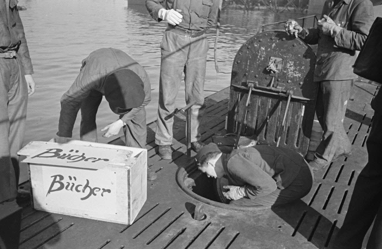 A Saint-Nazaire, dans le cadre de la semaine du livre allemand, la livraison et le chargement de livres pour un équipage de sous-marin allemand.