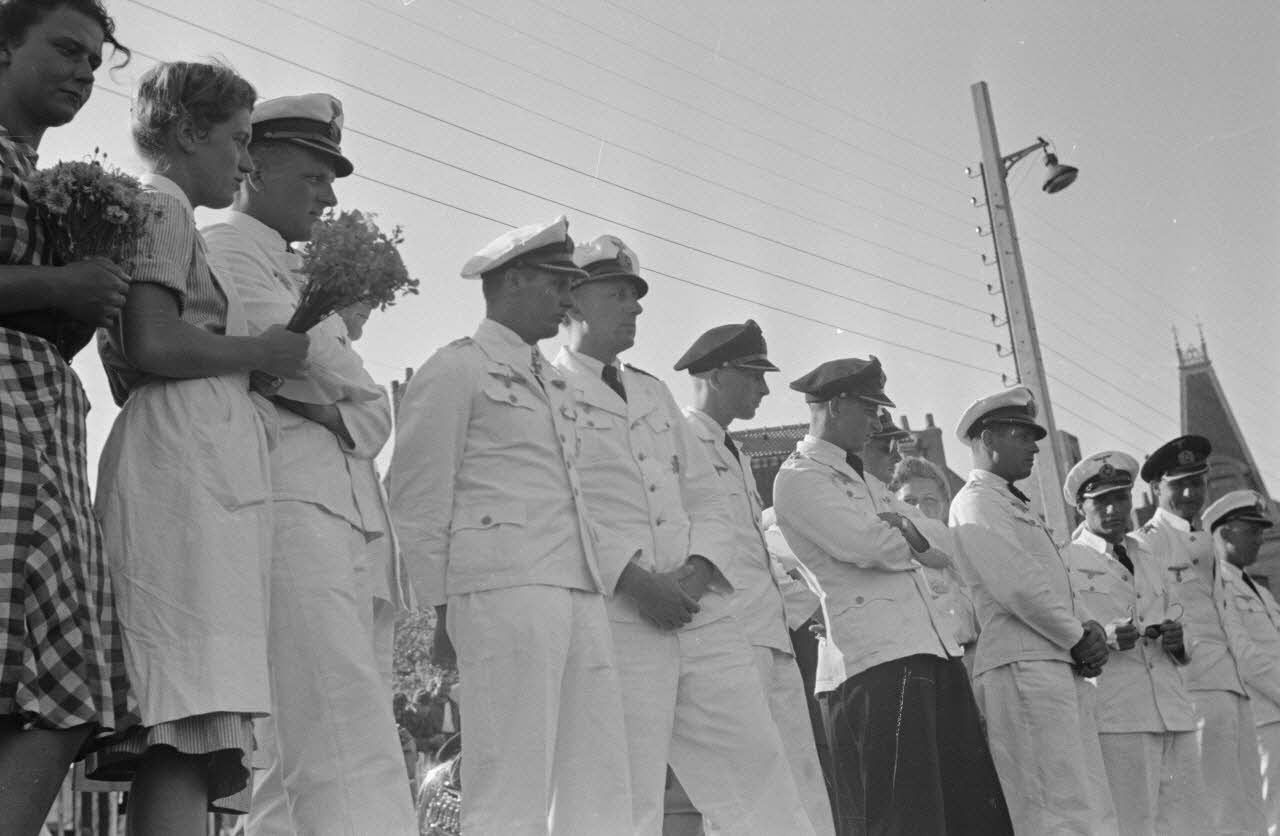 A Saint-Nazaire, des des officiers de la Kriegsmarine sont venus accueillir l'équipage du sous-marin U-96 du capitaine (Kapitänleutnant) Lehmann Villenbrook.