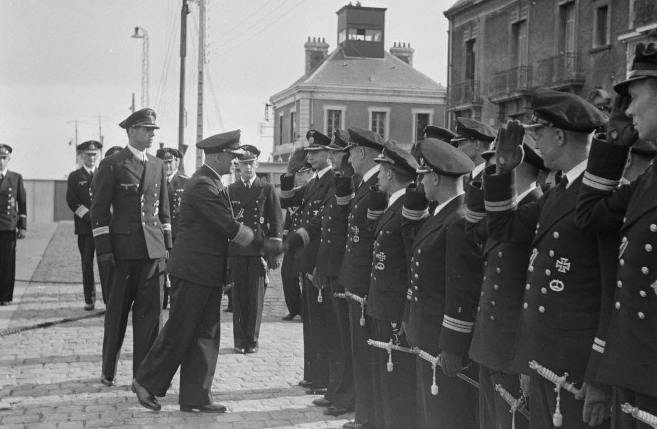 A Saint-Nazaire, l'amiral Otto Schniewind inspecte les personnels de la 7.Unterseebootsflottille peu avant l'appareillage des sous-marins U-93 et U-94.