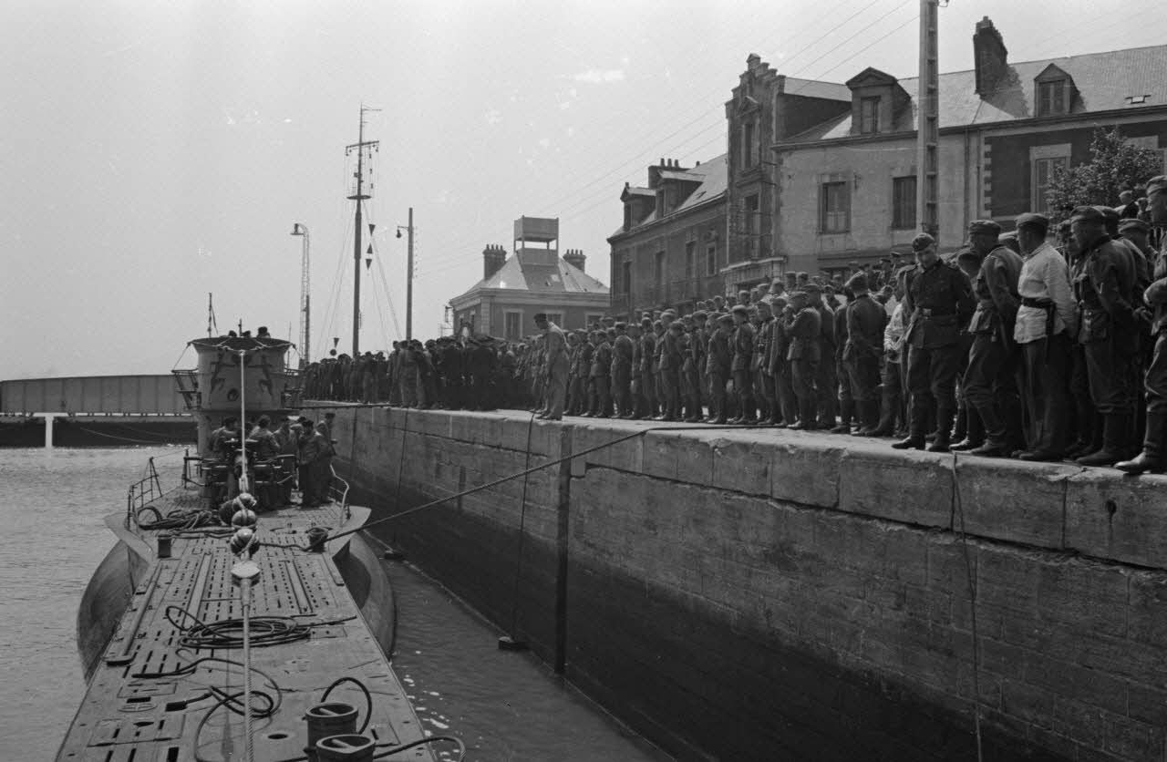 Au port de Saint-Nazaire, lors du retour du sous-marin U-552, des soldats de la Wehrmacht réservent un accueil à l'équipage.