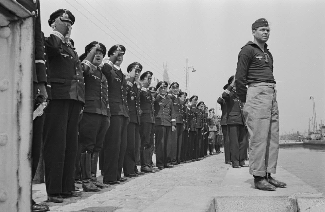 A Saint-Nazaire, lors du retour du sous-marin U-552, des officiers de la Kriegsmarine réservent un accueil chaleureux à son commandant le lieutenant (Oberleutnant zur See) Erich Topp et à son équipage.