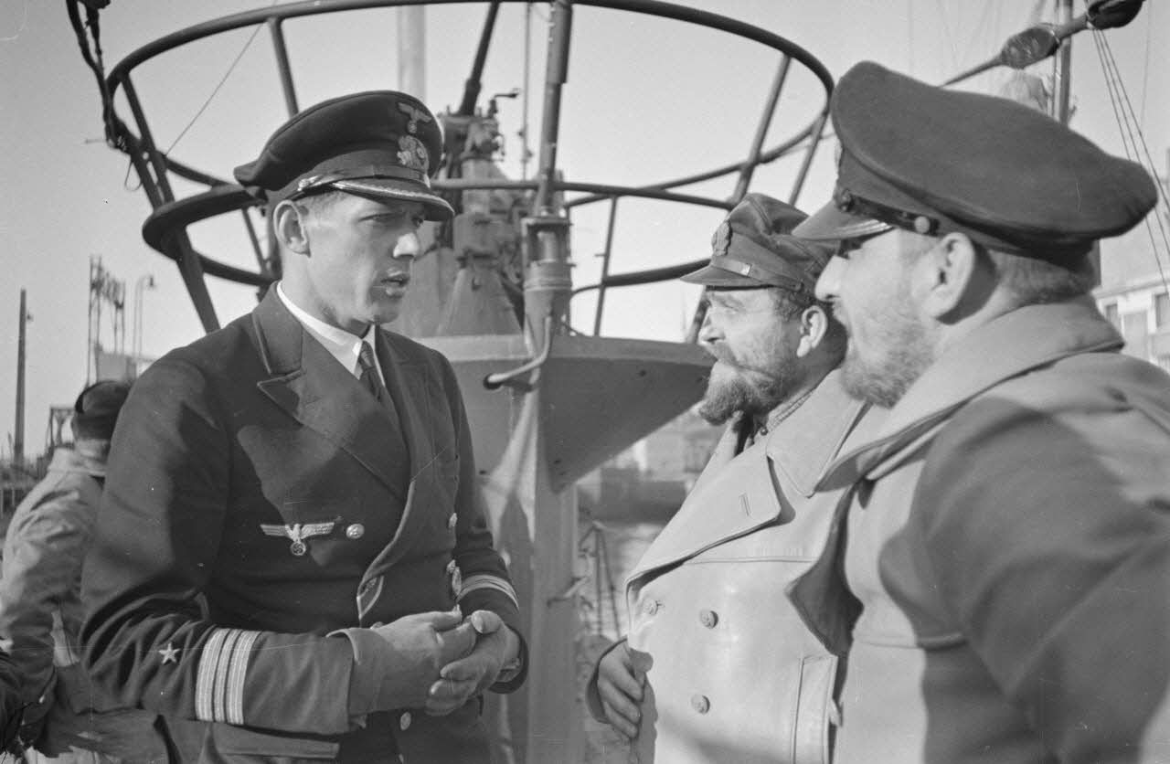 A Saint-NazaireLe Kapitänleutnant Endrass commandant du sous-marin Uboot U-46 sur le pont du U-97 (7.Uboot-Flotille), les deux sous-marins sont de retour de croisière par l'entrée sud du port.