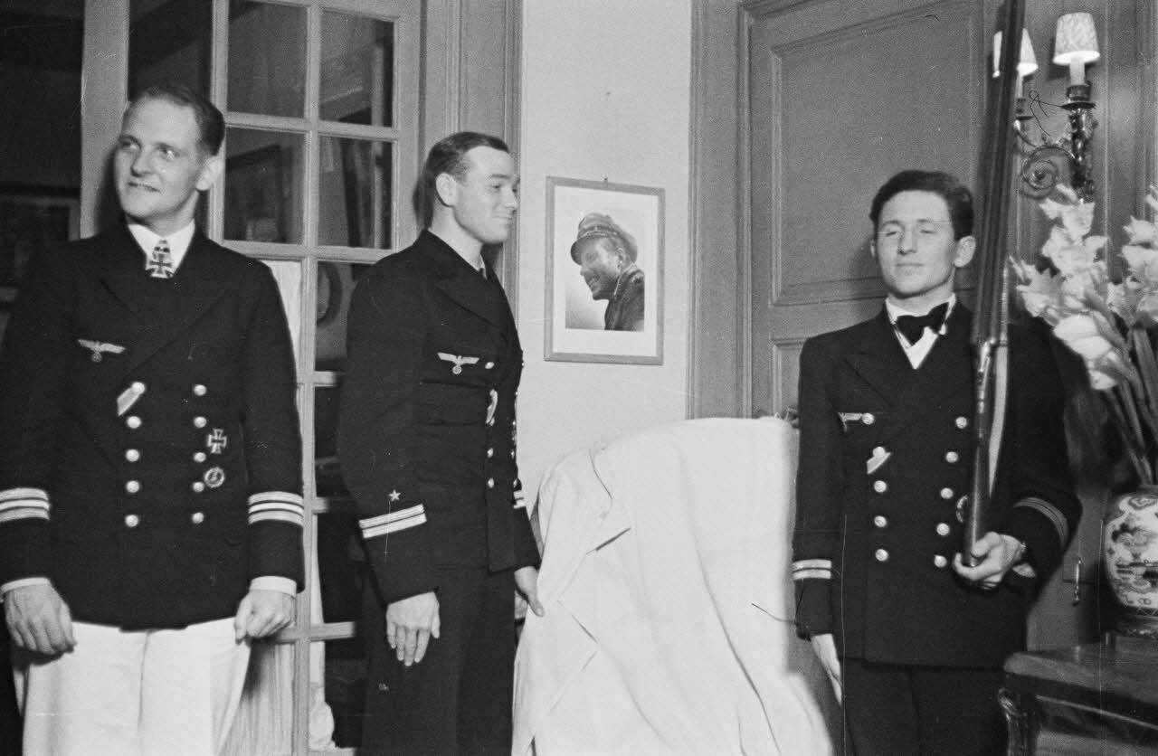 A Saint-Nazaire, une cérémonie non officielle lors de laquelle le commandant du sous-marin U-552, Erich Topp, et ses deux lieutenants, offrent un cadeau au reporter Heinrich Schwich.
