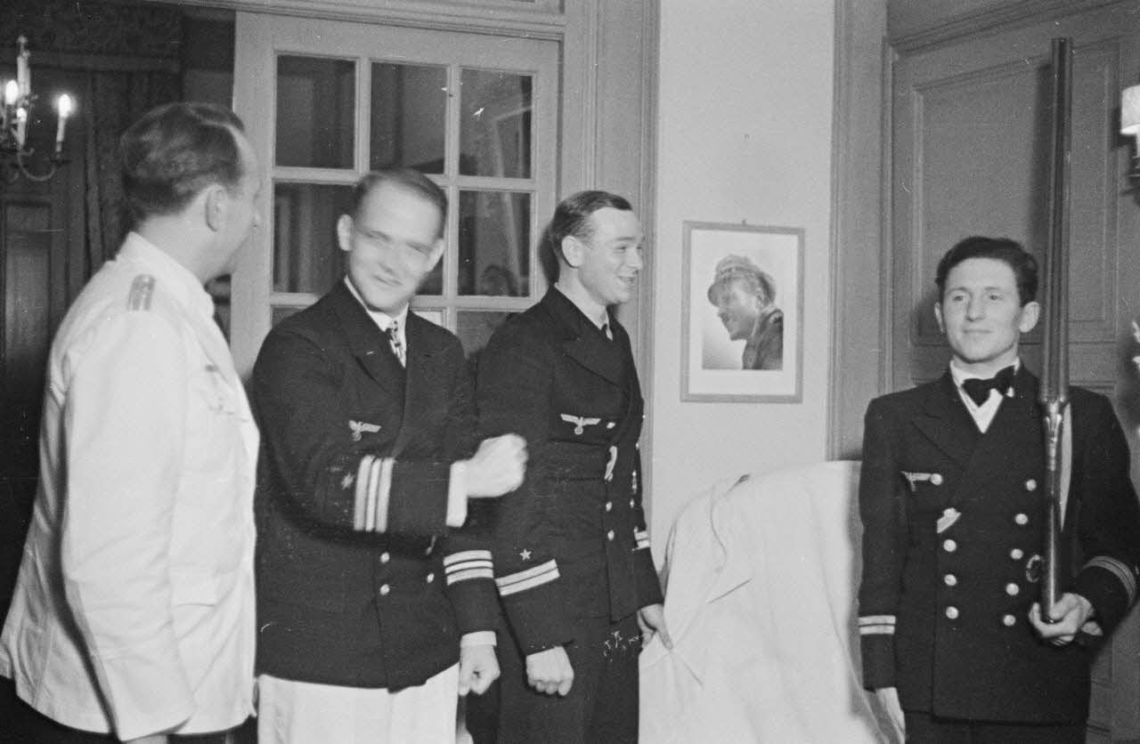 A Saint-Nazaire, une cérémonie non officielle lors de laquelle le commandant du sous-marin U-552, Erich Topp, et ses deux lieutenants, offrent un cadeau au reporter Heinrich Schwich.