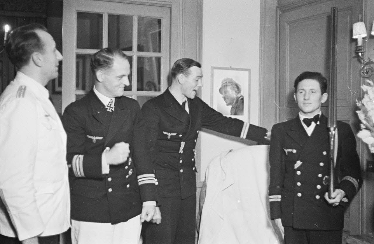 A Saint-Nazaire, une cérémonie non officielle lors de laquelle le commandant du sous-marin U-552, Erich Topp, et ses deux lieutenants, offrent un cadeau au reporter Heinrich Schwich.