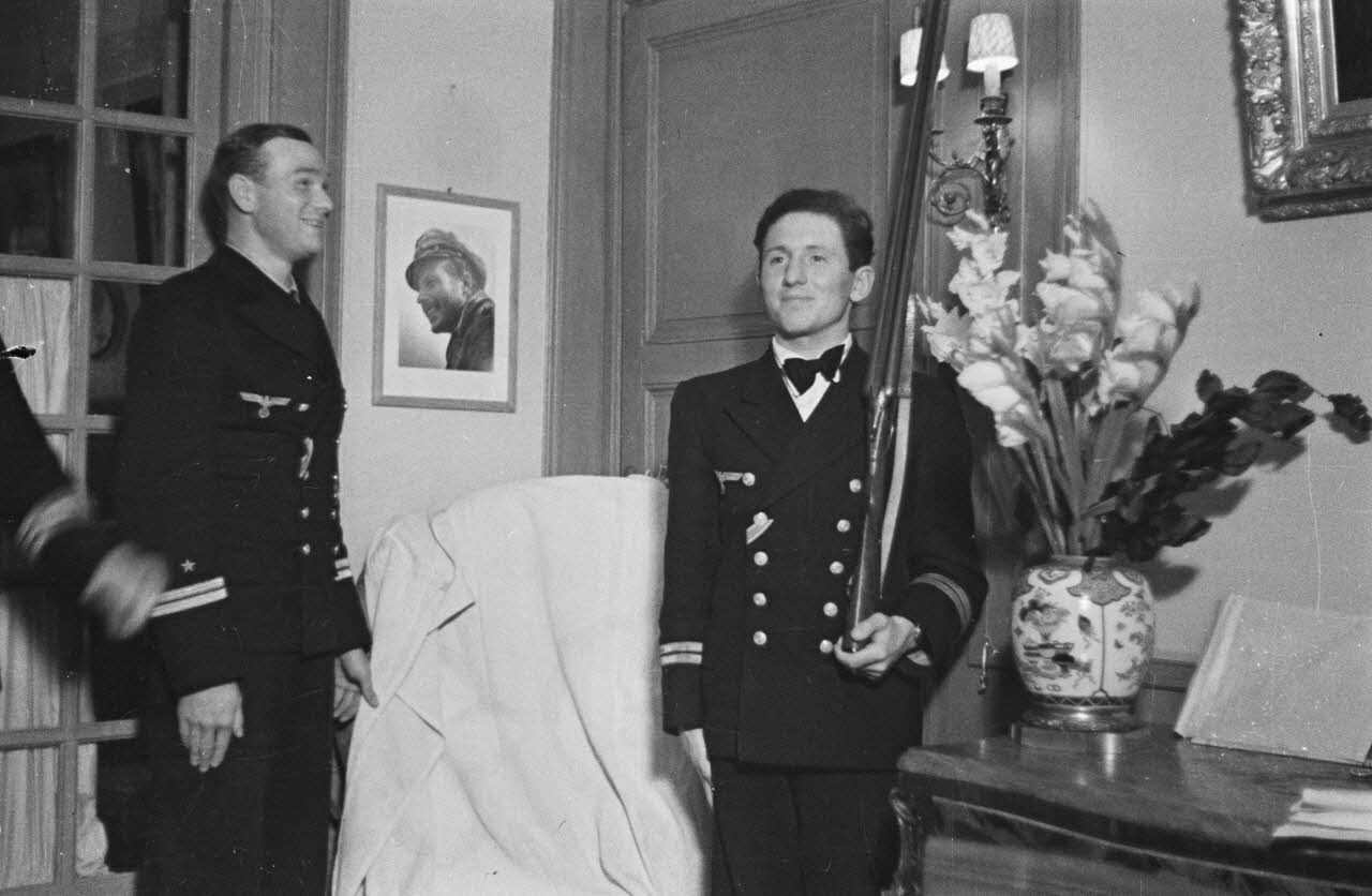 A Saint-Nazaire, une cérémonie non officielle lors de laquelle le commandant du sous-marin U-552, Erich Topp, et ses deux lieutenants, offrent un cadeau au reporter Heinrich Schwich.