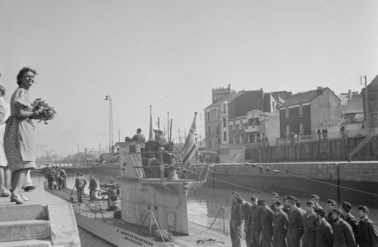 A Saint-Nazaire, une femme réserve un bouquet aux hommes du U-552 de retour de la 5e croisière du sous-marin commandé par le lieutenant (Oberleutnant zur See) Erich Topp.