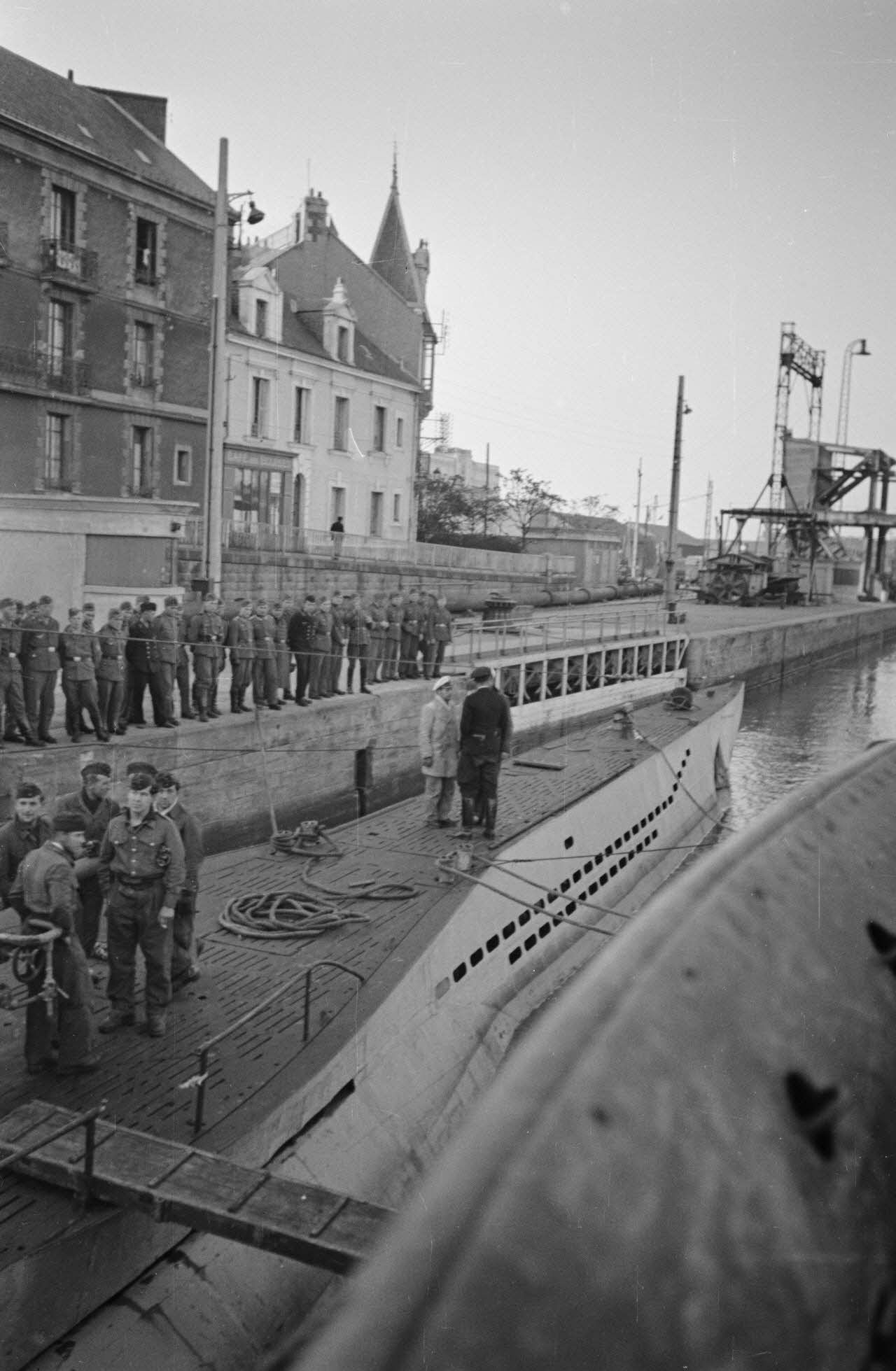 Les équipages des sous-marins allemands U-46 et U-97 débarquent sur le quai du port de Saint-Nazaire.