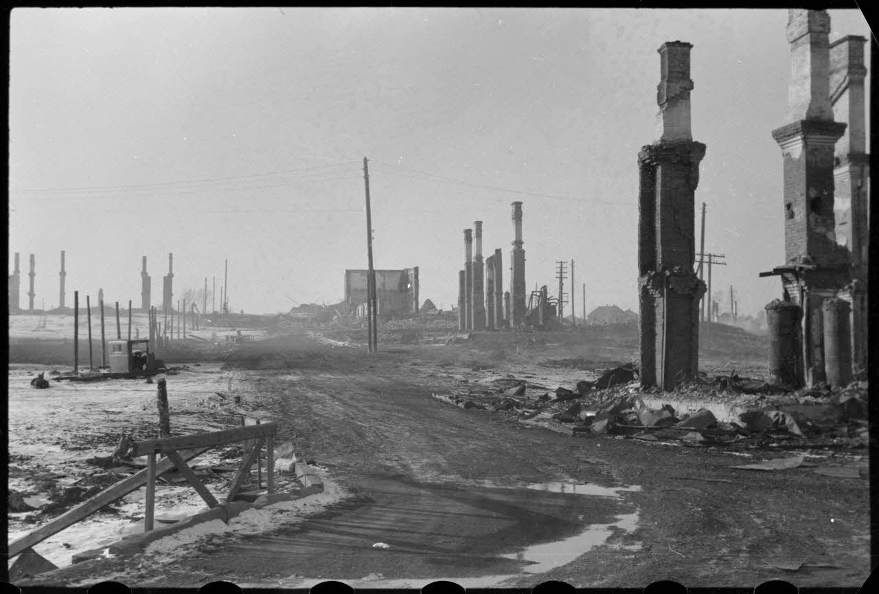 A Wjasma, les ruines du quartier de la gare, les maisons en bois ont été détruites, seules les cheminées s'érigent parmi les ruines.