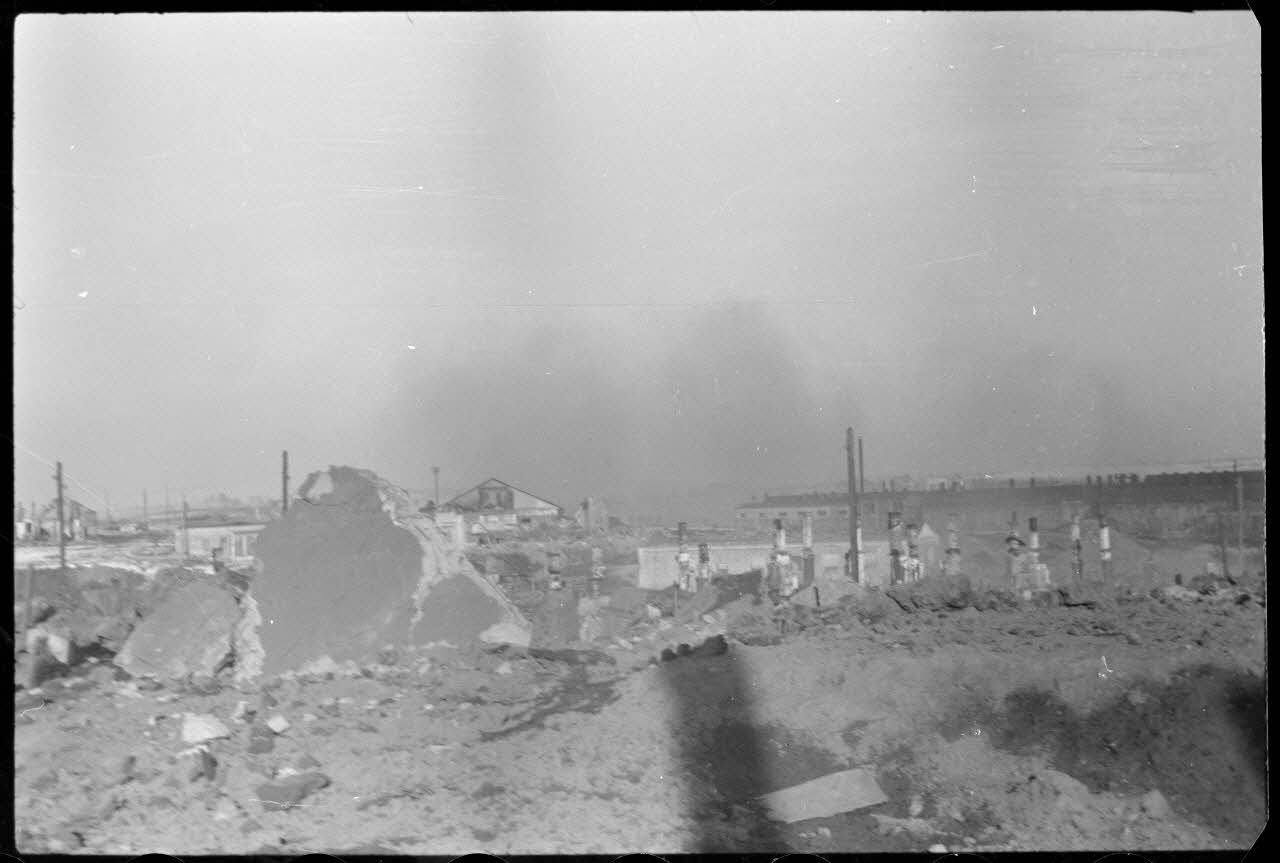 A Wjasma, les ruines du quartier de la gare, les maisons en bois ont été détruites, seules les cheminées s'érigent parmi les ruines.